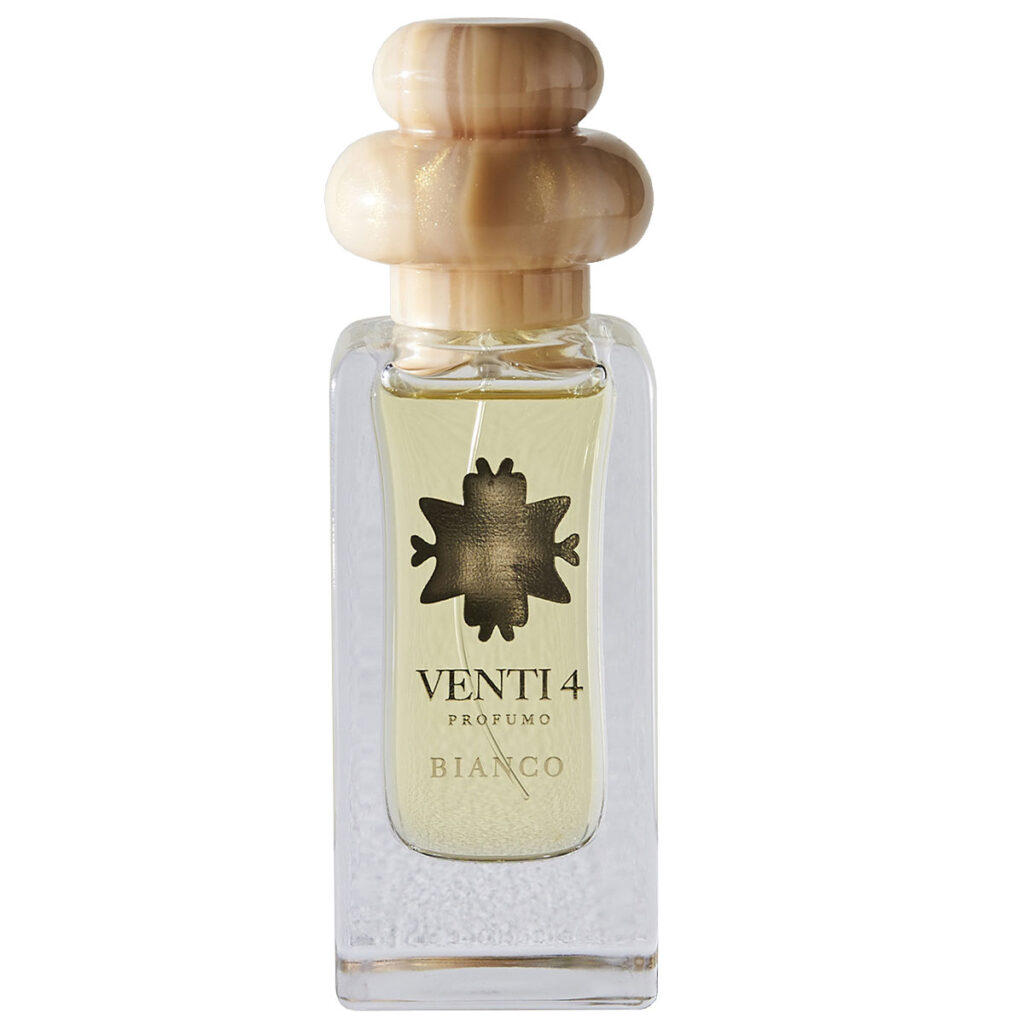 Venti4 Bianco ist ein heller, frischer Unisex-Duft mit zitrischem Start (Zitrone, Bergamotte), weißen Blüten (Jasmin, Gardenie, Magnolie) und einer weichen, cremig-warmen Basis aus Moschus und Haselnuss. Ein Duft wie sonnige Haut mit weißen Blüten.